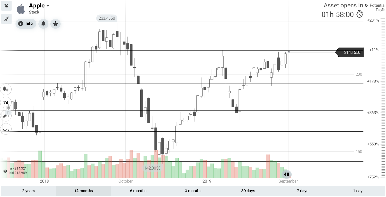 Berikut adalah contoh tingkat dukungan dan resistensi saham Apple. Harga sering berhubungan dengan tingkat ini kemudian melewatinya, menciptakan harga baru yang kemudian berhubungan dengan swing harga yang akan datang.